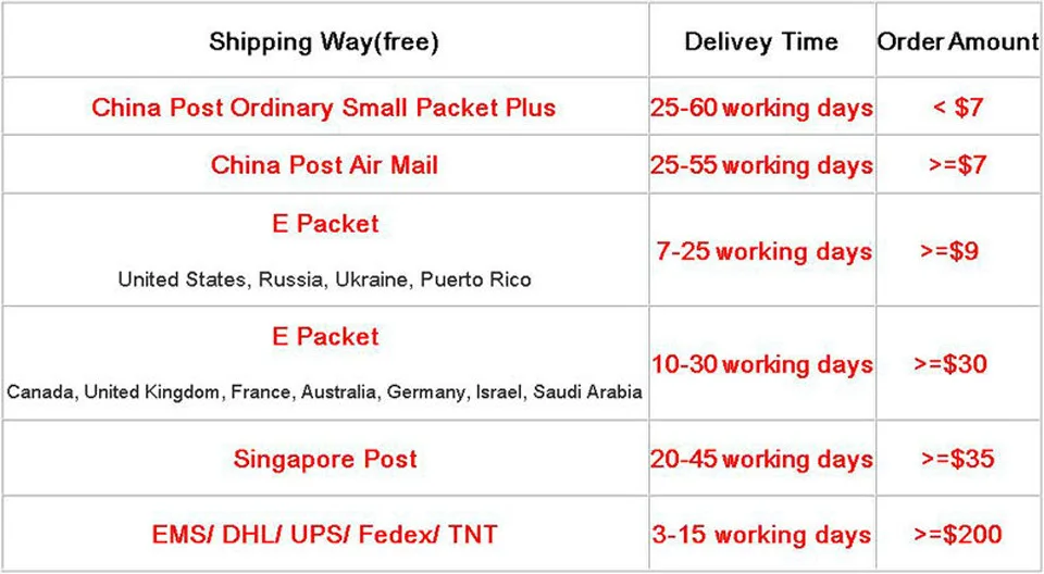 1.نحن نشحن جميع منتجاتنا مجانًا إلى جميع أنحاء العالم خلال 48 ساعة عن طريق EMS/DHL/UPS أو البريد السنغافوري/البريد الصيني، وستعتمد طريقة الشحن على المبلغ الإجمالي لطلبك: